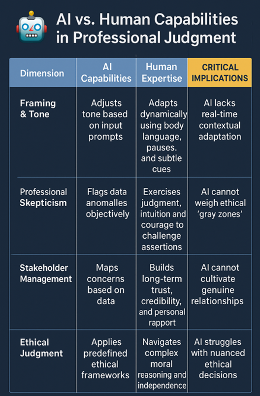 - Intensify focus on uniquely human capabilities: communication skills, ethical reasoning, professional skepticism, and stakeholder management.