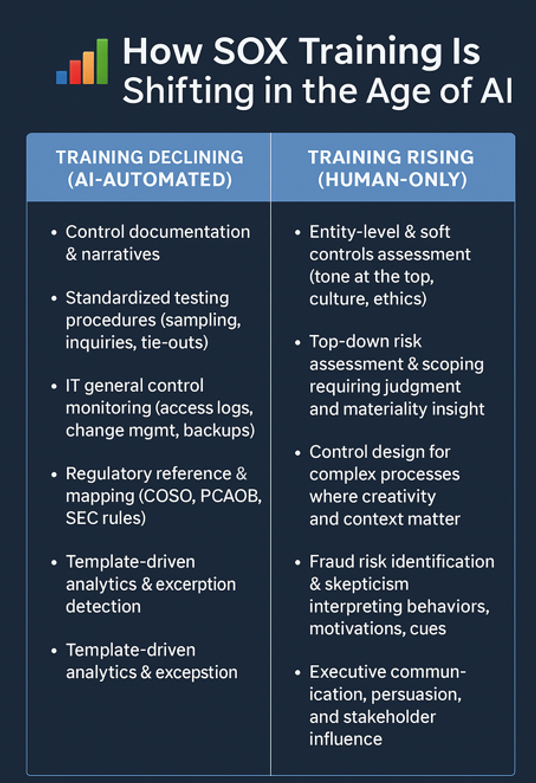 The implications for professional development are profound. AI is reshaping training needs, careers, risks and policies, requiring a fundamental shift in how SOX professionals prepare for their roles. Consider two training scenarios: In the past, a junior auditor might spend weeks learning to manually trace revenue recognition through multiple systems and document the findings in standardized templates. Today, AI can perform this tracing and generate draft documentation in hours. The training emphasis shifts from how to trace transactions to how to explain to a defensive CFO why an AI-flagged exception indicates a potential material weakness—a conversation requiring empathy, credibility, and negotiation skills no algorithm can teach.